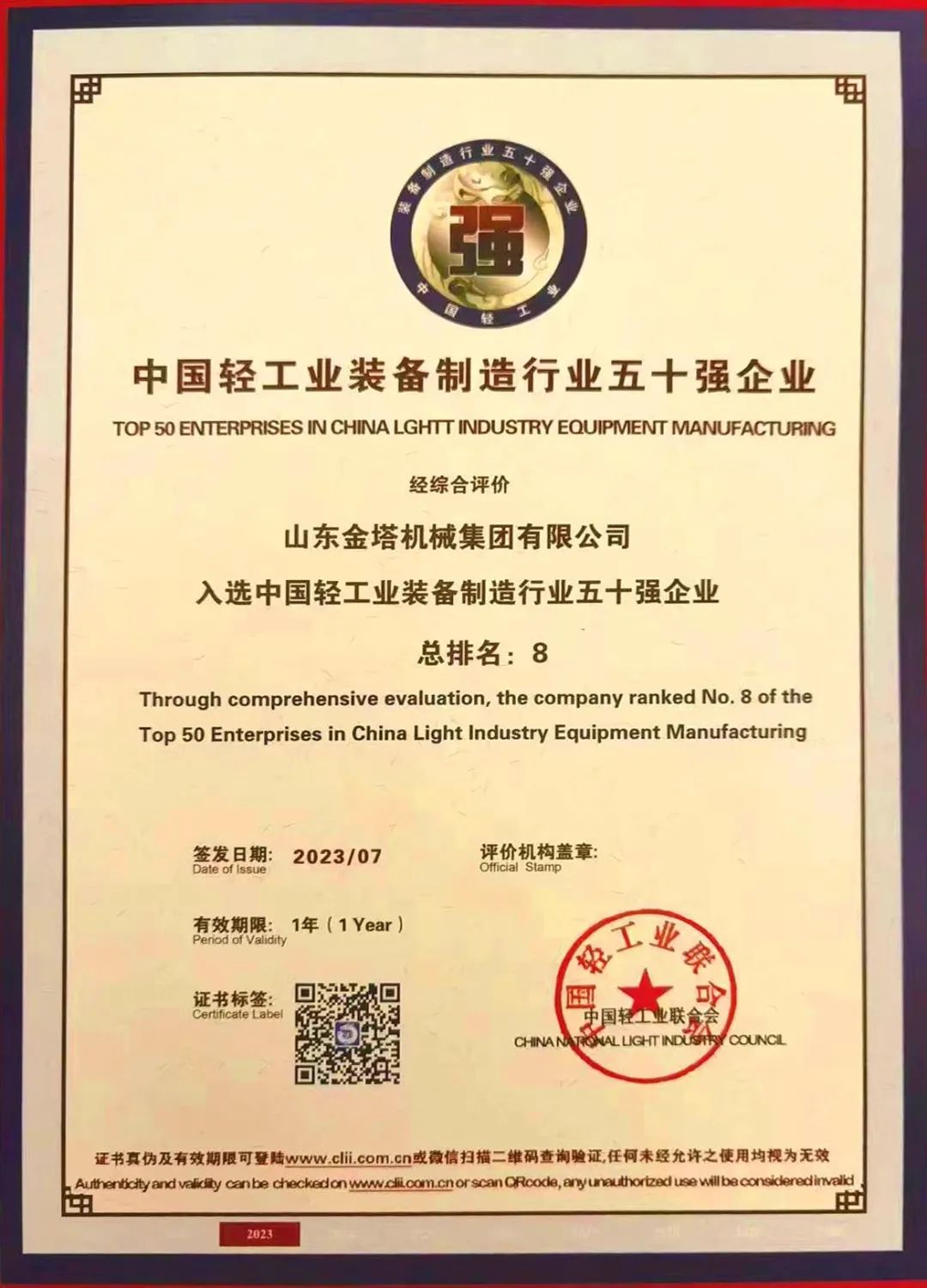 7月20日,由中國輕工業聯合會發布的中國輕工業裝備制造行業五十強企業正式揭曉,山東金塔機械集團位列50強第8位。至此,金塔集團自2017年發布排行榜評價榜單以來,連續七年入圍榜單。