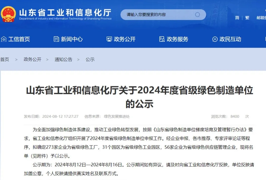 8月12日,省工信廳公示了2024年山東省綠色制造單位名單,山東金塔集團(tuán)金塔科技公司入選山東省綠色供應(yīng)鏈管理企業(yè)。